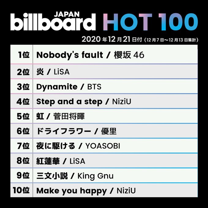 🎚 ביטיאס ממשיכים להחזיק בתואר האומן הזר היחיד בהיסטוריה שמחזיק ב-3 שירים סימולטנית בעשירייה הראשונה בתרשים בילבורד hot100 יפן. ג'ונגקוק ממשיך לככב בתרשים ה-bb hot 100 composers היפני עם film out שבוע 29 ברציפות.